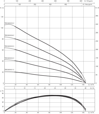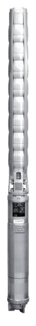 Całkowicie zanurzona, wielostopniowa pompa głębinowa do tłoczenia wody użytkowej (certyfikat ACS), z promieniowymi lub półosiowymi wirnikami o budowie segmentowej, do montażu pionowego i poziomego, z wbudowanym zaworem zwrotnym. Odporny na korozję silnik indukcyjny trójfazowy do rozruchu bezpośredniego lub gwiazda-trójkąt, napełniony mieszaniną wody i glikolu lub alternatywnie wodą użytkową. Hermetycznie zalany silnik, z uzwojeniem emaliowanym, impregnowany żywicą lub przezwajalny silnik z uzwojeniem izolowanym PVC i łożyskami samosmarującymi. Silnik chłodzony jest przez przetłaczane medium. Dlatego podczas pracy urządzenie musi być zawsze zanurzone. Przestrzegać wartości granicznych max. temperatury przetłaczanej cieczy i minimalnej prędkości przepływu. Montaż pionowy jest opcjonalnie możliwy z płaszczem chłodzącym lub bez niego. Przy montażu poziomym płaszcz chłodzący jest zawsze konieczny.