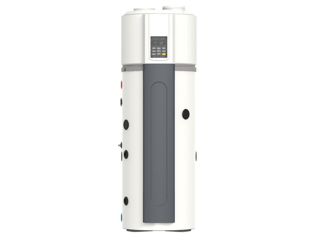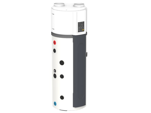 Pompa ciepła powietrze - woda z wbudowanym zasobnikiem ciepłej wody użytkowej ze stali emaliowanej oraz z wbudowanym króćcem cyrkulacji.